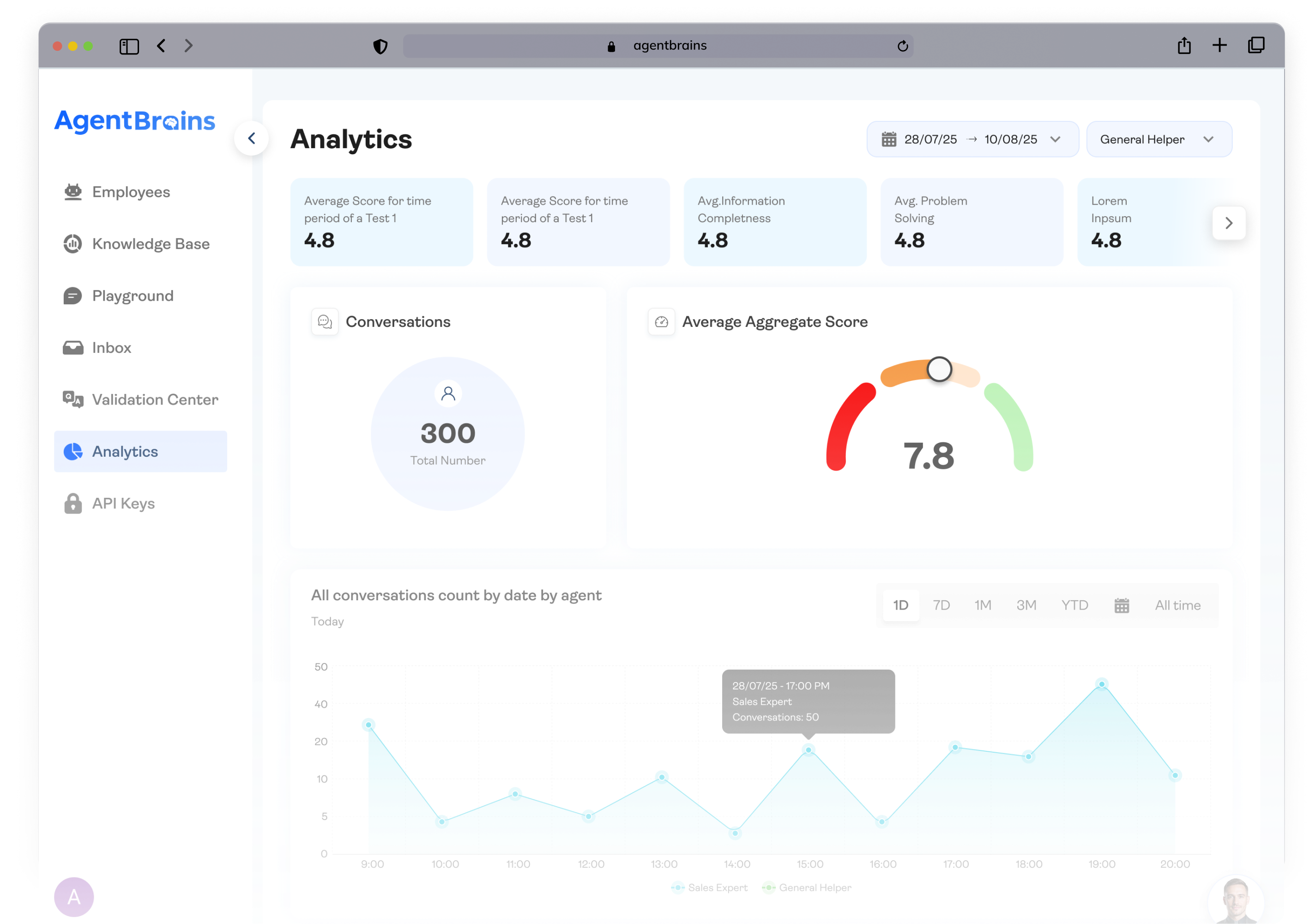 Most AI platforms give you a raw list of chat logs and maybe a token count. AgentBrains gives you an executive dashboard. We automatically score, categorize, and analyze every interaction to tell you not just how much your agents are talking, but how well they are performing—and what your customers are actually saying.