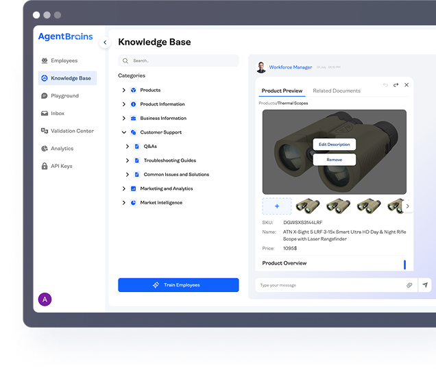 Text-only support is outdated. AgentBrains automatically extracts, analyzes, and labels images from your documents and website, turning static assets into dynamic visual tools. Whether you are using our pre-built AI Employees or building custom flows in platforms like n8n, your agents can now show the right image at the exact right moment.