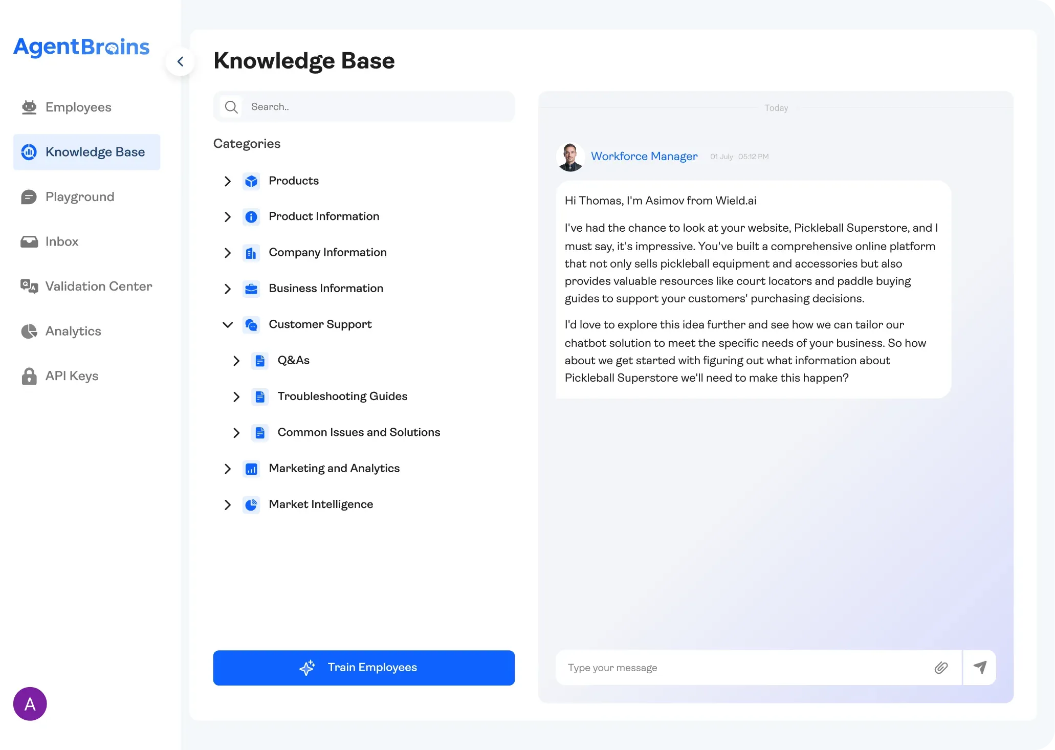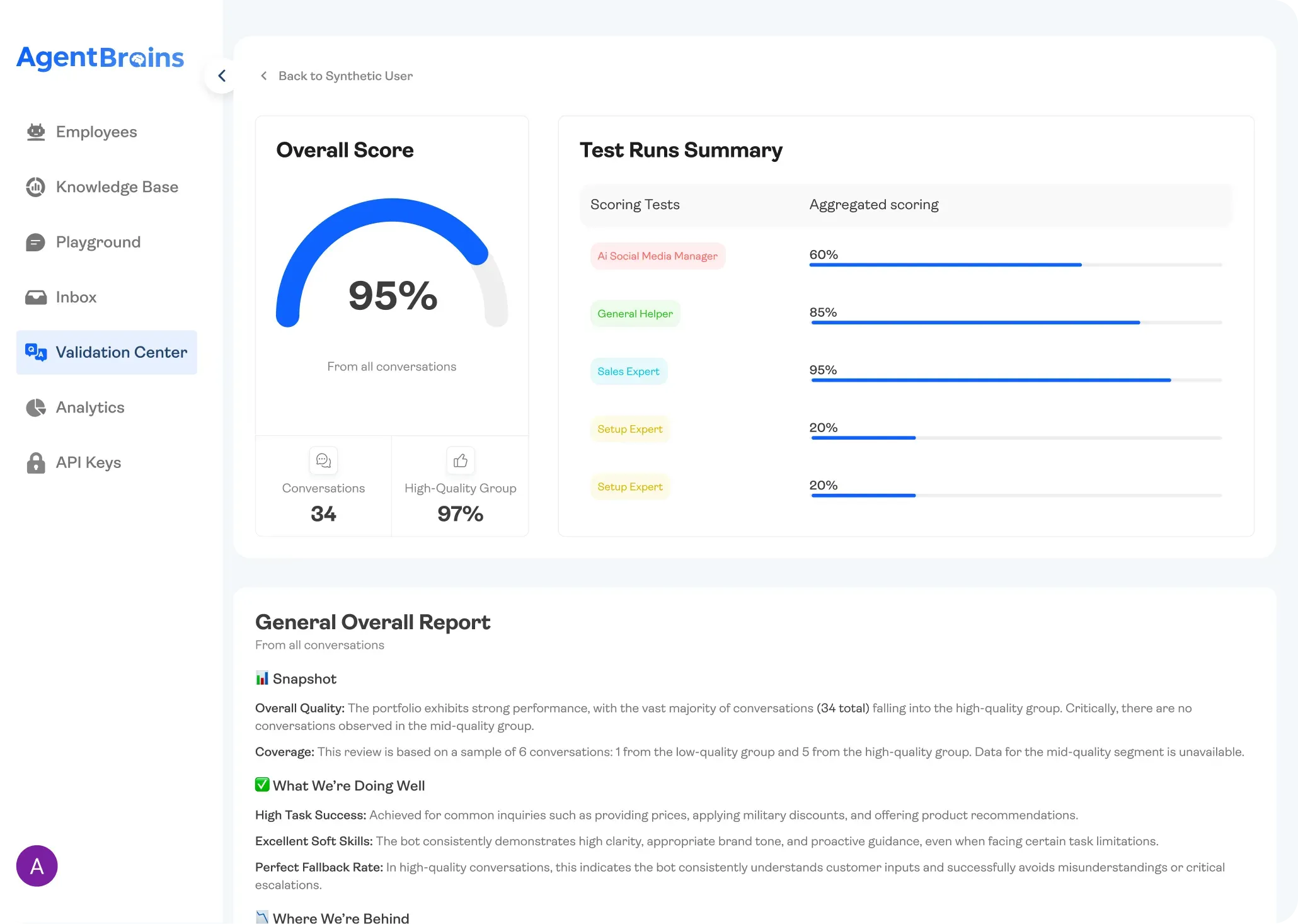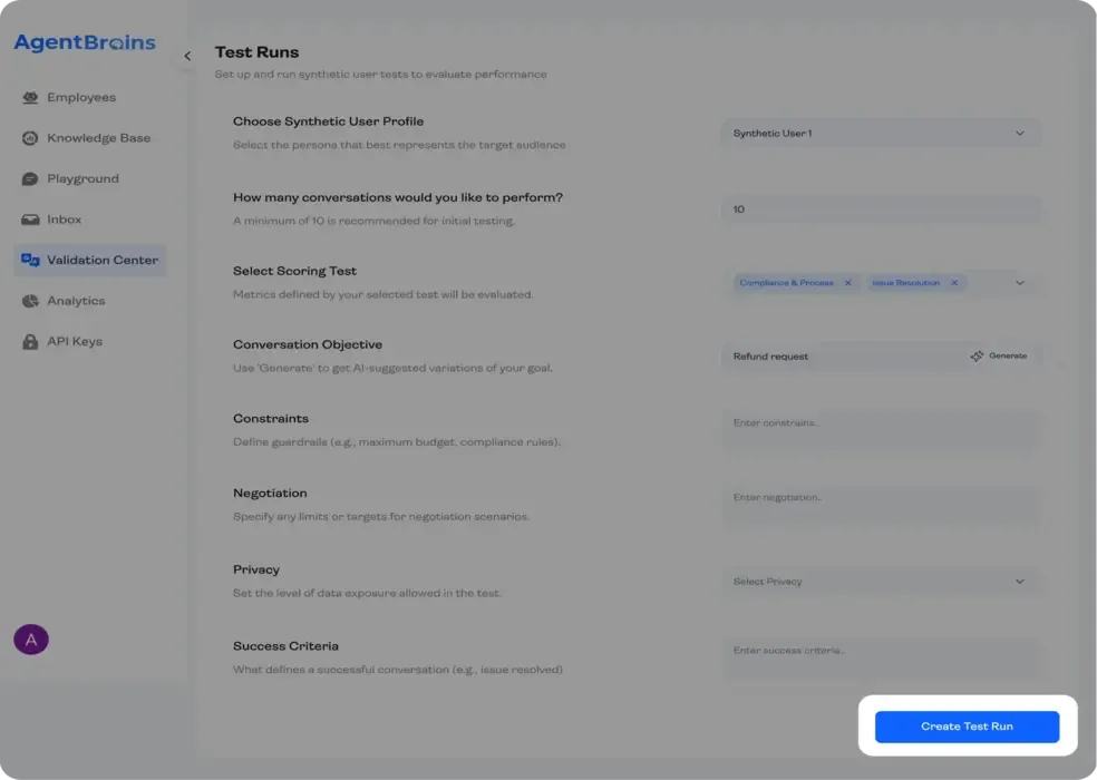 AgentBrains provides Synthetic Users to stress-test your agents before they ever talk to a customer. These simulators mimic real human behavior to help you catch errors early. Once you launch, they evolve into Digital Twins—learning from your actual chat history to help you continuously refine and improve your AI's quality.