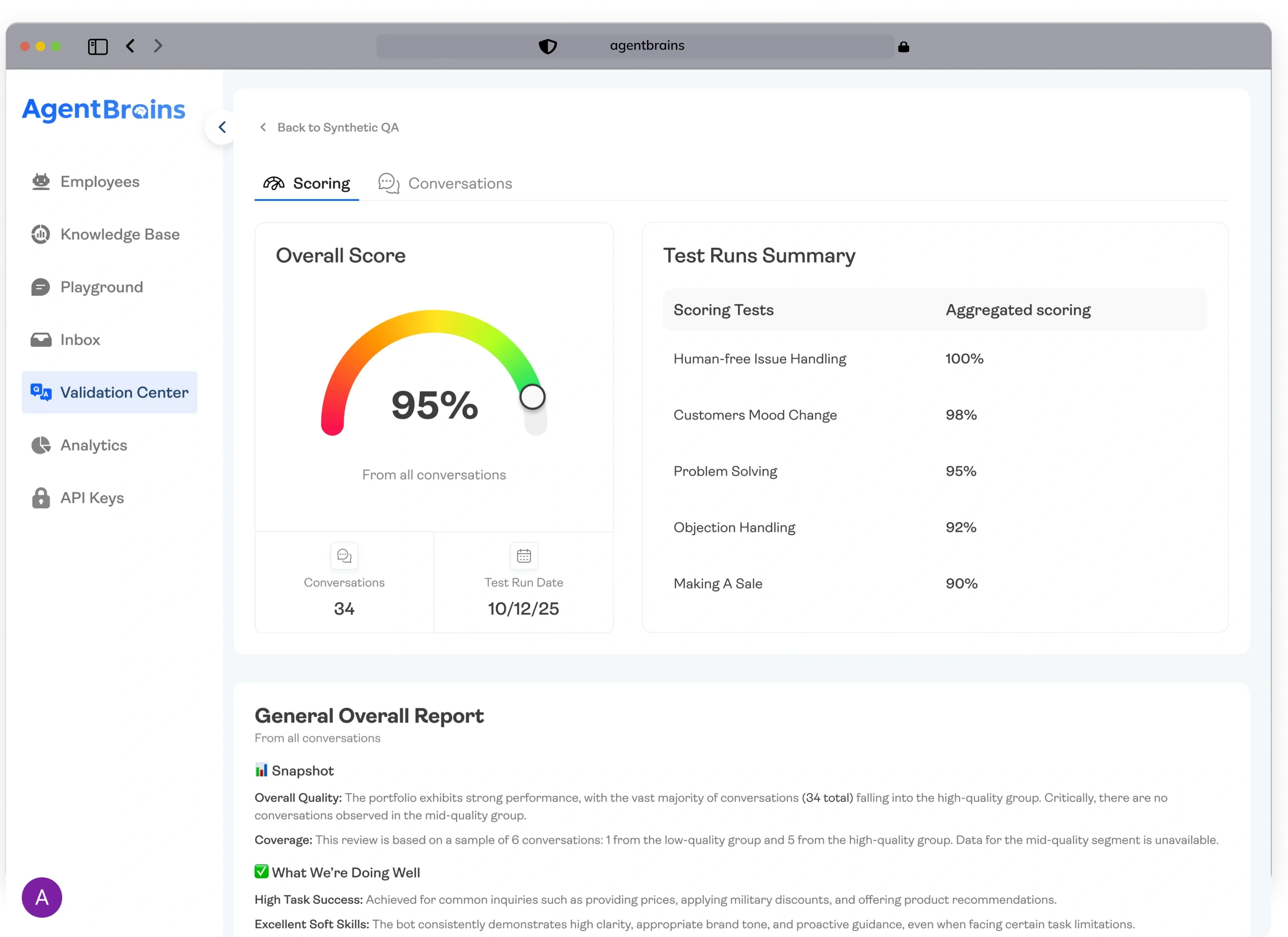Every interaction is scored through the same engine used on live conversations — quantifiable results you can compare, track, and act on. Faster than manual testing, more realistic than scripted cases, and fully measurable from the first run.